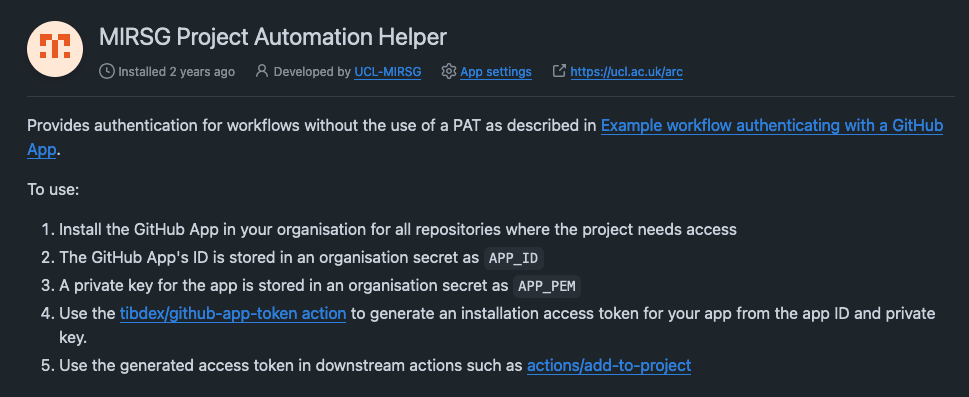 It is possible to also create your own apps accessible either publicly or just for the internal organisation. The UCL-MIRSG/.github/actions/add-to-project use the MIRSG Project Automation Helper app to avoid attributing project board movements to an individual user.