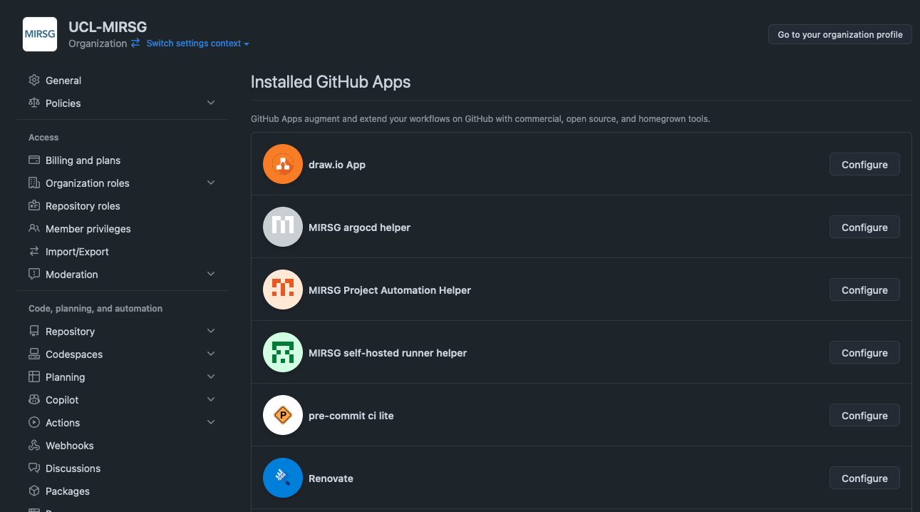 admin repository, e.g. UCL-MIRSG/admin./.github/settings.yml.The settings files can be used to set the policies at the org, suborg or repo level.