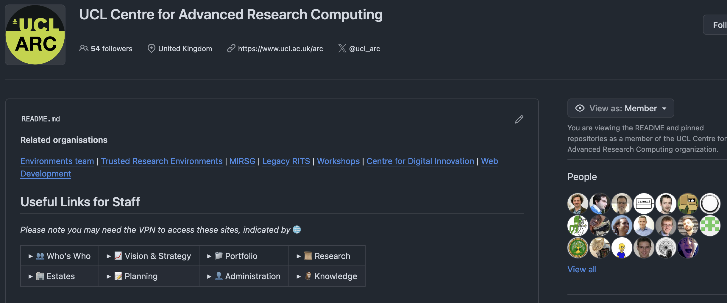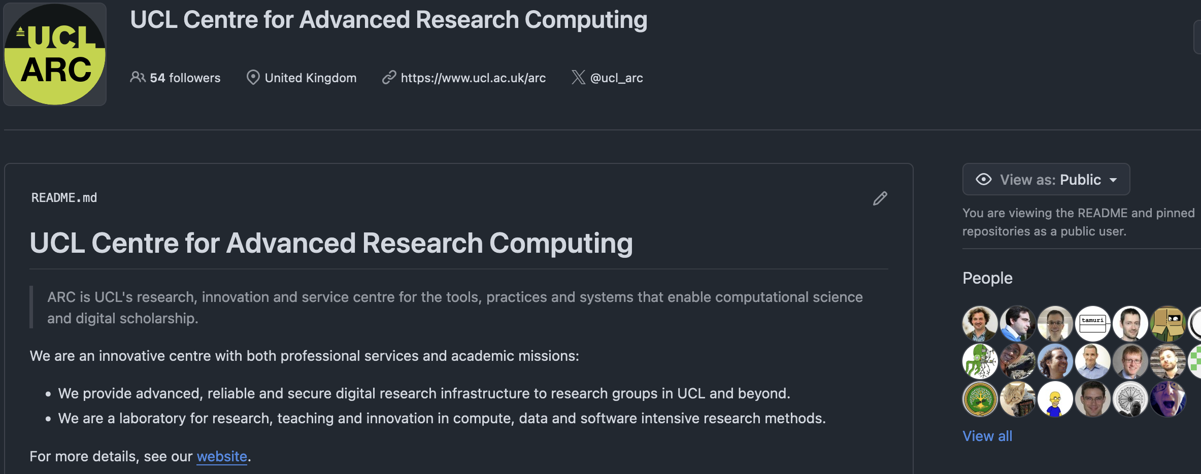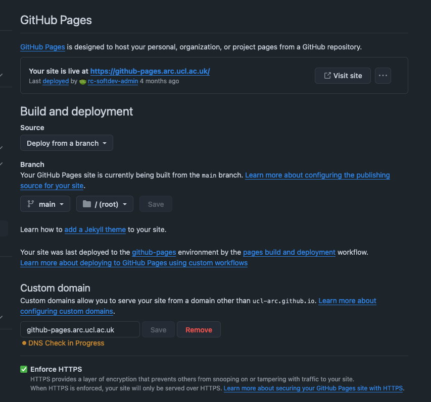 ORGANISATION.github.ioCan have a GitHub Pages per organisation and repository, e.g. UCL-ARC/ucl-arc.github.io.