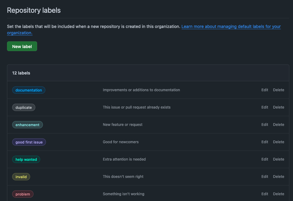 Set the labels that will be included when a new repository is created in this organisation.