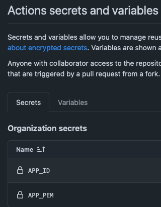Actions can use a single set of generated secrets to be used in all actions, e.g. APP_ID, APP_PEM.